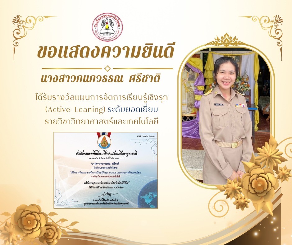 ขอแสดงความยินดีกับคุณครูกนกวรรณ ศรีชาติ ที่ได้รับรางวัลแผนการจัดการเรียนรู้เชิงรุก (Active Learning) ระดับยอดเยี่ยม