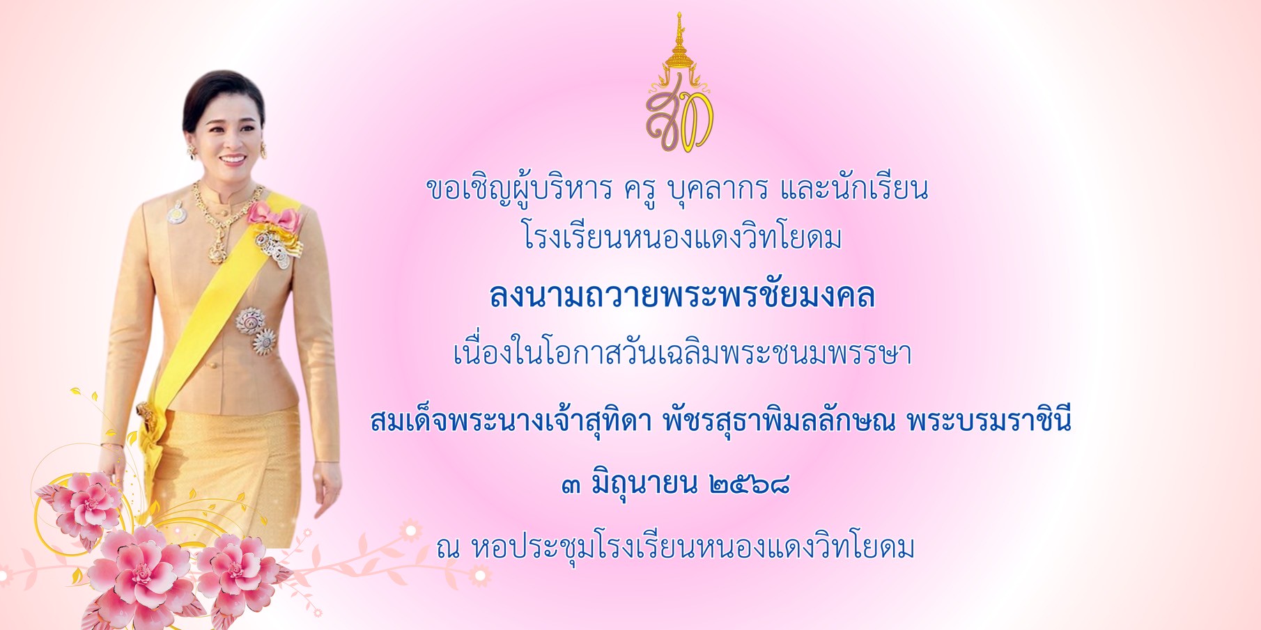 ขอเชิญผู้บริหาร ครู บุคลากร และนักเรียน โรงเรียนหนองแดงวิทโยดม ลงนามถวายพระพรชัยมงคล เนื่องในโอกาสวันเฉลิมพระชนมพรรษา สมเด็จพระนางเจ้าสุทิดา พัชรสุธาพิมลลักษณ พระบรมราชินี ๓ มิถุนายน ๒๕๖๘ ณ หอประชุมโรงเรียนหนองแดงวิทโยดม